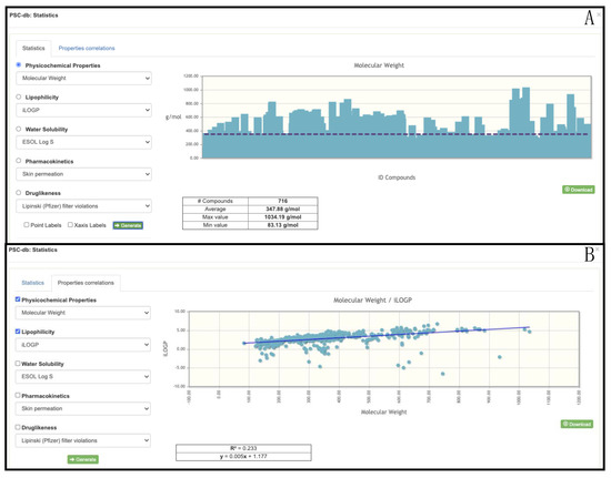 Finally, we have provided a tool to calculate and to plot different statistics using the predicted physicochemical and pharmaceutical properties (Figure S3). To access this section the user should use the “Stats” button (Figure 2), which will provide access to the statistics and properties correlations options. The statistics option allows to graph one of the selected properties for a chosen group of compounds. In Figure 3A the molecular weight (MW) of 716 alkaloids (preselected compounds) is shown as a bar chart, and the average, min, and max MW values are given. In Figure 3B the correlation between the MW and the lipophilicity of the group of the same compounds is displayed. With this feature, the user is able to correlate different families by their physicochemical and pharmaceutical properties. For instance, alkaloids and flavonoids could be correlated concerning their molecular weight, the Topological Polar Surface Area (TPSA), or with respect to properties such as lipophilicity, water-solubility, or drug-likeness.