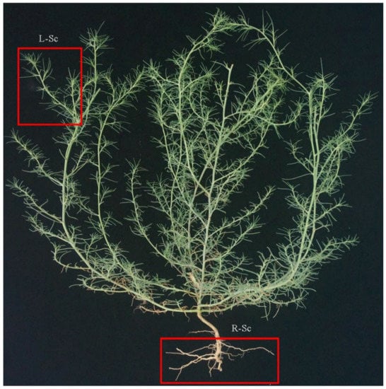 All samples were collected from Luoyang, Henan Province, China, in the middle of July 2020. These samples were flash-frozen in liquid nitrogen containers, and stored at −80 °C for further analysis. The shoots and roots of S. collina were named L-Sc and R-Sc, respectively (Figure 1). For each sample, three biological replicates were independently analyzed. Five well-developed individuals were collected and combined for each repeat.