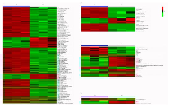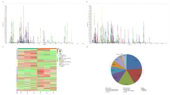 The identification and structural analyses of the primary and secondary spectral data of the metabolites detected by mass spectrometry were based on the MWDB database (Metware Biotechnology Co., Ltd. Wuhan, China) and public databases, including MassBank (http://www.massbank.jp/ (accessed on 2 February 2021)), KNAPSAcK (http://kanaya.naist.jp/KNApSAcK/ (accessed on 2 February 2021)), HMDB (http://www.hmdb.ca/ (accessed on 2 February 2021)), MoToDB (http://www.ab.wur.nl/moto/ (accessed on 2 February 2021)), and ChemBank (http://chembank.med.harvard.edu/compounds (accessed on 2 February 2021)); PubChem (https://pubchemblog.ncbi.nlm.nih.gov/ (accessed on 2 February 2021)); NIST Chemistry Webbook (http://webbook.nist.gov/ (accessed on 2 February 2021)); and METLIN (http://metlin.scripps.edu/index.php (accessed on 2 February 2021)). Metabolomics data were processed using Analyst (Version 1.6.3, Sciex, Framingham, MA, USA).