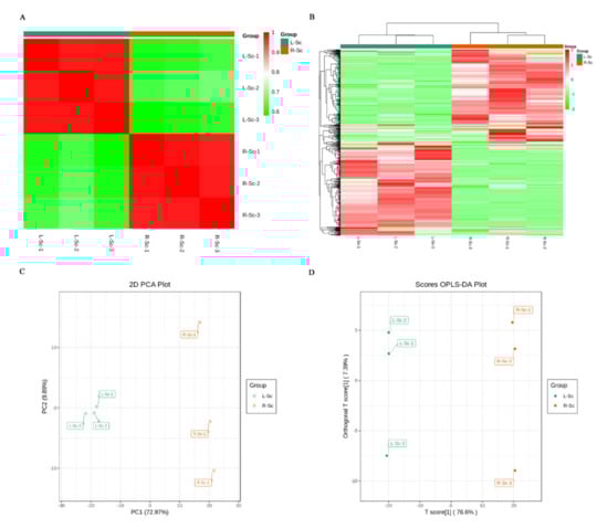 The identified metabolites analysis. (A) Pearson’s correlation coefficients among the L-Sc and R-Sc samples. (B) Cluster analysis of the identified metabolites from the L-Sc and the R-Sc. (C) Principal component analysis (PCA) of the L-Sc and R-Sc. (D) Orthogonal partial least squares discriminant analysis (OPLS-DA) model plot of the identified metabolites in the L-Sc and the R-Sc.