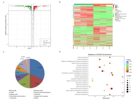 To identify differentially accumulated metabolites between L-Sc and R-Sc, a fold change ≥ 2 or a fold change ≤ 0.5 and variable importance in project (VIP) ≥ 1 were used as the screening criteria. A total of 408 DAMs were detected between L-Sc and R-Sc (Table S2). Of these, 233 putative metabolites were down-regulated and 175 putative metabolites were up-regulated in the R-Sc compared with the L-Sc (Figure 4A). The DAMs could be categorized into more than ten classes (Figure 4B), but the majority of DAMs were categorized into three classes, including flavonoids (32.11%), phenolic acids (17.89%) and lipids (15.69%; Figure 4C).