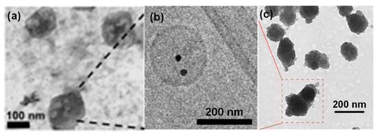 Figure 3 shows the TEM images of some typical examples of inorganic nanoparticle-loaded exosomes prepared through biological pathways. Figure 3a shows iron oxide nanoparticle-loaded exosomes derived from MDA-MB-231 cells, where PEG-functionalized iron oxide nanoparticles (20–30 nm) were successfully encapsulated inside exosomes by culturing nanoparticles treated mesenchymal stem cells (MSCs) for 24 h [35]. In another example, citrate-coated 12 nm Au nanoparticles modified with polyethylene glycol and folic acid were successfully incorporated in exosomes derived from melanoma B16F10 cells for caner targeting and in vivo tracking (Figure 3b) [36]. Porous silicon or drug loaded porous silicon nanoparticles were coated with exosomes secreted by human hepatocarcinoma Bel7402 cells for efficient lung cancer chemotherapy [37], as shown in Figure 3c.