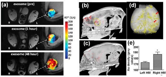 (a) In vivo MR imaging of mice injected with iron oxide nanoparticle-loaded exosomes derived from melanoma cells. After 48 h footpad injection, the T1-weighted images and R2* mapping clearly suggested accumulation of exosomes in lymph node [42]. (b–e) In vivo CT imaging of Au nanoparticle-loaded exosomes after intranasal administration into mice with acute striatal stroke: (b) a CT image 24 h post-administration (the ischemic region is indicated by the yellow circle), (c) a CT image of control animal with saline injection, (d) ex vivo CT imaging and Au quantification within the animal brain 24 h post administration, and (e) CT analysis of Au density of left and right hemispheres (note: stroke was introduced in the right hemisphere) [32].*: (p < 0.05).