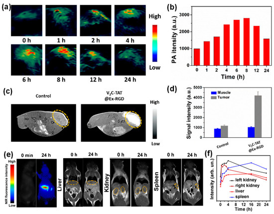 Another major advantage of inorganic nanoparticles is easy engineering for multi-functionality, allowing for dual mode tracking or simultaneous imaging and therapy. For example, cell-derived vesicles loaded with Au-iron oxide nanoparticles enabled both NIR fluorescence and MR imaging [46]. In another example, V2C QDs were successfully loaded into exosomes derived from MCF-7 breast cancer cells via electroporation [30]. Here, the QDs were modified with TAT peptides for nucleus targeting and the exosomes were functionalized with Arg-Gly-Asp (RGD) peptide for cell targeting. These exosomes exhibited distinct NIR absorbance from V2C QDs, serving as great contrast agents for photoacoustic imaging (PAI). PAI uses a radio frequency-pulsed laser to irritate the region of interest, and the thermal expansion caused by the absorbed heat leads to acoustic wave detectable by ultrasounds for an image [30]. Figure 5a showed in vivo PA images of MCF-7 breast tumor-bearing mice at different times post injection of these V2C QD-loaded and functionalized exosomes. The PA signal reached to a maximum around 8 h at the tumor site. The PA signal quantification agreed well with the imaging observation (Figure 5d). Additionally, V2C QDs can serve as MRI contrast agents due to the 3D electronic configuration of V4+ and quantum confinement, leading to multi-modal imaging. Figure 5c shows the T1-weighted MR images of MCF-7 breast tumor-bearing mice 24 h post-exosome injection. Significant MR signal enhancement was observed compared to the control mice with saline injection, which was consistent with the MR signal quantification results (Figure 5d).