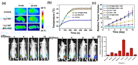 In addition to drug encapsulation, inorganic nanoparticles themselves can serve as a means for cancer therapy. For example, MSC-derived exosomes loaded with 40 nm hollow Au nanoparticles allowed for direct monitoring of exosome trafficking between cells [48]. In particular, these exosomes only targeted the cell type of origin when comparing different cell types, such as MSCs, monocytes, and melanoma cells. These hollow Au nanoparticles exhibited near IR absorption (700–100 nm). Therefore, these hollow Au nanoparticle-loaded exosomes were responsive to NIR radiation and induced selective cell death through a photothermal effect. In another study, V2C QDs-loaded exosomes not only enabled PAI and MRI imaging, but also exhibited high effectiveness in photothermal therapy in vitro under near IR–II laser irradiation [30]. Significant apoptosis of MCF cells treated with V2C QDs-loaded exosomes was observed under 1064 nm laser irradiation of 0.96 W cm−2 power intensity for 10 min. This NIR laser irradiation led to a temperature increase up to 45 °C. The in vivo photothermal effects were also observed in tumor-bearing mice with intravenous injection of the V2C QDs-loaded exosomes. Specifically, animal groups with the injection of V2C QDs-loaded exosomes showed evident temperature increase at the tumor sites and significant tumor growth repression under laser irradiation (Figure 6a–c). The IR thermal images and temperature changes at the tumor sites clearly demonstrated the temperature increase after laser irradiation (10 min 1064 nm, 0.96 W cm−2) as shown in Figure 6a,b. Figure 6c shows the comparison of the tumor growth curves of the MCF-7 tumor-bearing mice in different groups, suggesting that the RGD and TAT peptide functionalization greatly enhanced the efficiency of the photothermal therapy [30]. In addition, no adverse side effects were observed, indicated by the minimal animal weight fluctuation and tissue damage.