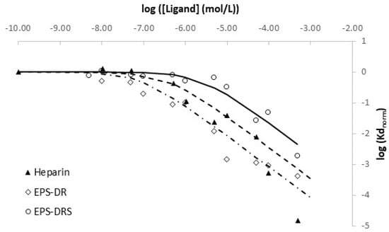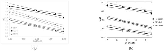 For the two EPS samples, a decrease in Vh was observed with increasing ionic strength. This decrease is slightly higher for EPS-DR and -DRS than for heparin, meaning that EPS-DR and -DRS are more sensitive to the ionic strength changes. This could be explained by considering the overall charges surrounding EPS-DR or -DRS chains that are more important compared to the heparin ones. EPS-DR and -DRS exhibit more ionized functional groups that could be shielded by the counter-ions from the background electrolyte, leading to the folding of the polymer chain. The decrease in intrinsic viscosity with increasing ionic strength reflects a change in conformation: the expansion of the polymer chain is clearly affected by the addition of ions that seem to make the ionized functional groups of the polymer inaccessible. Coil expansion, and thus the intrinsic viscosity, decreased with ion concentration. This means that, with a higher Vh, the EPS polymers seem to be more elongated, exhibiting a larger portion of available ionized functional groups, i.e., carboxylate, available for the counter ion, i.e., Na+. By contrast, when Vh is lower, the polymer is more compact and tightly coiled, reducing the portions of ionized functional moieties for the counter ions.