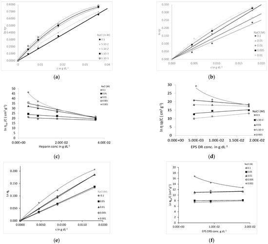 Since polysaccharides are polyelectrolytes, their viscosimetric behavior was studied as a function of the concentration in water and in dilute aqueous solutions containing variable amounts of NaCl. This is also of importance since, for polyelectrolytes, as with polysaccharides of interest, the second virial coefficient is very sensitive to ionic strength. The results of the relative viscosity ln ηr of EPS-DR and heparin are presented in Figure 5. In Figure 5a,b,e, the relative viscosity increases with polyelectrolyte concentration, and is progressively suppressed with the increase in the salinity of the solvent. This was in agreement with the viscosimetric behavior of other types of polyelectrolytes [34]. The ln ηsp/c value allows for estimating [η] according the following formula.