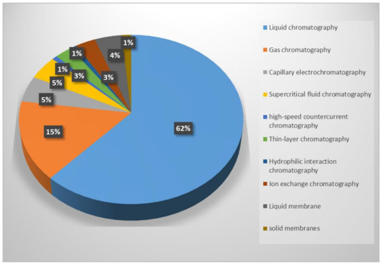 Chiral separation techniques include CSP-based chromatographic separation (e.g., liquid chromatography (LC) (including high-performance liquid chromatography (HPLC), hydrophilic interaction chromatography (HILIC), and ion exchange chromatography (IEC)), gas chromatography (GC), capillary electrophoresis (CE), supercritical fluid chromatography (SFC), thin-layer chromatography (TLC), and high-speed countercurrent chromatography (HSCCC) and membrane-based separation (e.g., liquid and solid membrane separation). The rapidly increasing amount of research activity related to chiral selectors (CSs) for separation applications in the field of chromatography and membrane-based separations is shown by the plot in Figure 1.