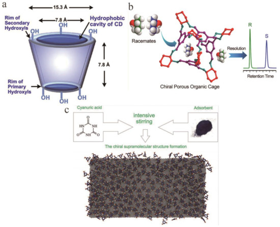 Chiral selector materials for gas chromatography (GC). (a) Truncated cone structure of cyclodextrin showing the hydrophilicity of the outside of cyclodextrin due to the distribution of hydroxyl groups there. (b) Application of homochiral porous organic cage to GC to separate enantiomers. (c) Principal scheme of cyanuric acid chiral superstructure formation on the graphene surface.