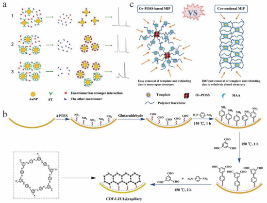 Chiral selector material for capillary electrochromatography (CEC). (a) Schematic diagram of chiral separation in streptomycin-modified gold nanoparticle (ST-AuNP) systems with different concentrations. (1) At low ST-AuNP concentration, (2) with the ST-AuNP concentration increasing up to the optimal value, (3) at an ST-AuNP concentration that is too high. (b) Scheme for the growth of COF-LZU1 on the inner wall of aldehyde group-functionalized capillary. (c) Schematic representation of Ov (octavinyl)-based molecularly imprinted polymers (MIPs) and conventional MIPs.