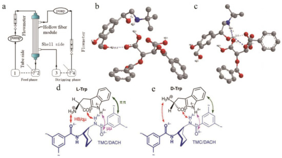At present, according to different structural properties and preparation processes, chiral split liquid membranes can be divided into bulk liquid membranes (BLMs), emulsified liquid membranes (ELMs), and support liquid membranes (SLMs). BLM is relatively stable, easy to configure, and the easiest liquid membrane to operate. The membrane phase does not need to be supported, and the material liquid phase and the receiving phase are separated by only a relatively thick layer of immiscible organic phase fluid. Recently, four new enantiopure crown ethers containing a diphenylphosphinic acid unit were synthesized [140], and these units exist as ligands in an aqueous source phase/lipophilic organic bulk liquid membrane that is continuously controlled by the pH of the medium. In the aqueous receiving phase system, protonated phenylethylamine and phenylglycol are transported enantioselectively. Compared with the BLM, the ELM has a higher mass transfer rate and good separation performance. The oil phase and the water phase containing the film solvent are made into a W/O emulsion under high-speed stirring, and this emulsion is dispersed to another W/O/W emulsion formed in this kind of aqueous solution [141]. However, due to the cumbersome operation of the emulsion membrane system, the small range of application and membrane leakage, it has not been applied in the separation of chiral compounds until recent years. In addition, due to its unique advantages of high selectivity and high throughput, SLM has attracted more and more attention in recent years [142]. They are also the most widely used liquid membranes in the separation of chiral compounds. The membrane is usually a porous inert base membrane (support) immersed in a membrane solvent in which a carrier is dissolved, and through the action of surface tension, the membrane solvent is filled with micropores to form the SLM [143]. During use, the liquid film is lost after contacting the liquid phase and the receiving phase, which causes the function to decline. Therefore, the support material has a great impact on the separation process. Generally, hydrophobic materials such as polyethylene, polypropylene, or polytetrafluoroethylene are used. Porous membranes work well as support materials. For example, Zhang [144] and others have studied a chiral liquid membrane using l-tartaric ester dissolved in n-octane as the liquid membrane phase and polyvinylidene fluoride hollow fibers as the membrane carrier to separate racemic ibuprofen. In this work, the hollow fiber module was operated in recirculation mode (Figure 9a), the ibuprofen buffer was dissolved in sodium phosphate–phosphate and passed through the flow tube side, and the sodium phosphate–phosphate buffer solution was passed through the shell side. Another study [145] used a hollow fiber support liquid membrane for chiral separation of salbutamol. In this study, O,O-dibenzoyl-(2S,3S)-tartaric acid (+)-DBTA and di(2-ethylhexyl)phosphoric acid were used as chiral and achiral extractants, respectively. The separation of enantiomers was achieved by simultaneous extraction and stripping. Using CS Chem3D Ultra, the initial structures of (+)-DBTA and salbutamol enantiomers were constructed. At the same time, a density functional theory method was used to optimize each structure. No symmetric constraints were found. When the bonds were calculated after a long time, the optimized complex configuration was obtained. At the same time, chiral recognition was achieved through hydrogen-bond interactions. The number of hydrogen bonds between S-salbutamol and (+)-DBTA (Figure 9b) was less than the number of hydrogen bonds between R-salbutamol and (+)-DBTA (Figure 9c); that is, the complex of (+)-DBTA and R-salbutamol was more stable. Different from the previous research, Gaálová et al. [146] recently successfully explored the formation of a non-porous composite membrane for the first time. This study dissolves piperazine or m-phenylene diamine (MPD) in deionized water to form an aqueous phase and dissolves 1,3,5-trimesoyl chloride (TMC) in n-hexane to form an organic phase. Then, the chiral substance (S, S)-1,2 diaminocyclohexane (DACH) was used to replace the variable part of MPD, and finally, a membrane suitable for enantiomeric separation was obtained. At the same time, the three-point interaction model was used to study the mechanism by which TMC + MPD/DACH recognizes Trp enantiomers. It was found that the combination of l-Trp with TMC + MPD/DACH conforms to the proposed mechanism and that the four proposed interactions are all involved (Figure 9d), but d-Trp maintains only two hydrogen bonds and loses the π-π stack (Figure 9e), which is the arrangement required based on its configuration.