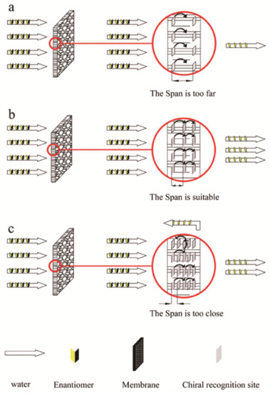 In 1986, the first work on chiral solid membranes was proposed by Y. Osada. This research fixed l-menthol or d-camphor to the surface of polymer-based membranes using plasma technology. The separation medium was an aqueous solution, and pressure drove the resolution of chiral samples of tryptophan (Trp) or proline and exploration of the chiral solid membrane. Compared with chiral liquid membranes lacking long-term stability, chiral solid membranes have better stability, permeability, and chiral selectivity, and can adapt to large-scale industrial production [137,138]. Therefore, the current research on chiral films mainly focuses on solid films. Currently, chiral two-component solid membranes can be categorized as bulk solid membranes (BSMs), modified solid membranes (MSMs), and molecularly imprinted solid membranes (MISMs) based on the membrane properties and manufacturing processes. Usually, a chiral base membrane material is used to prepare a cast film under certain conditions, and then the membrane structure is fixed by cross-linking and other methods, and finally BSM that can realize the separation of chiral compounds is obtained [141]. For example, in 2014, Lei et al. [147] first prepared a methyl methacrylate-N-isopropylacrylamide (MMA-NIPAm) polymer with surface functionalization and monodispersity through atom transfer radical precipitation polymerization. The resulting chiral selective MMA-NIPAm cation exchange membrane can realize the efficient separation of racemic equol. In addition, research has been conducted to prepare a chiral polymer membrane with 64–78% amino acid separation rate by in-situ interfacial copolymerization of trimesoyl chloride and l-arginine on a polysulfone ultrafiltration membrane. Unlike BSM, MSM uses techniques such as covalent grafting, dipping, or esterification to fix and coat the surface or pores of the base film with a polymer layer with chiral separation, such as a polymer containing a chiral selective agent, polymers of sugar side chains or chiral metal complexes and polymers of acetylated β-cyclodextrin surface-functionalized cellulose are used to prepare composite membranes that can achieve efficient separation of chiral compounds [148]. That is, the chiral separation at this time mainly occurs in the surface layer, and the base film plays only a supporting role. At present, the most widely selected materials suitable for solid film modification are polymer surfaces. In recent years, based on the superior mechanical strength, good thermal stability, excellent atomic thickness and chemical inertness of graphene materials, an example of the evolution of a graphene oxide (GO) base membrane into a new type of screening membrane has appeared. For example, in 2017, Meng and his colleagues [149] used l-glutamic acid (Glu) as a chiral selector to modify graphene sheets to facilitate the penetration of target chiral compounds, and then Glu-GO membrane was obtained by vacuum filtration through cellulose acetate membrane acting as a porous carrier. As a permeation model, the study also tested the chiral resolution of 3,4-dihydroxy-D,l-phenylalanine by Glu-GO membrane, and found that it not only has higher selectivity but also has a flux that is 1–2 orders of magnitude higher than that of ordinary chiral separation membrane. In order to achieve large-scale production of chiral separation membranes, a study used [150] mussel-inspired chemistry to prepare chiral separation polysulfone membranes and then modified and covered with dopamine, and then β-cyclodextrin, which acts as a chiral selector, forms a coating on the surface of polydopamine, and the obtained mussel-inspired chemically modified membrane has the same mechanical properties as the normal polysulfone base membrane, and under the optimal pH value, the racemic mixture of tryptophan can be efficiently separated. BSMs are prepared by using a chiral basic film material under certain conditions to prepare a casting film, and then the membrane structure is fixed by crosslinking and other methods to finally obtain a solid film that can achieve separation of chiral compounds [141]. Unlike BSMs, MSMs are coated with a polymer layer with chiral separation on the surface of the base membrane by using techniques such as grafting to prepare a composite membrane that achieves chiral resolution. That is, the chiral separation at this time mainly occurs in the surface layer, and the base film plays only a supporting role. In addition, molecular imprinting can be used to create molecular recognition sites [151]. By introducing molecular recognition sites in the desired template, highly heterogeneous holes can be formed in a solid film. These holes target only one of the enantiomers (D or L), conforming to its configuration to allow it to pass, so the other enantiomer is intercepted to achieve chiral separation. Due to the advantages of being well designed, well recognizable, and practical, MISMs have also become a research hotspot in recent years. In one study [148], a monodispersed methyl methacrylate–N-isopropyl acrylamide (MMA-NIPAm) polymer was prepared by a one-pot method and then 3 weight% (wt%) MMA-NIPAm copolymer was dissolved in dimethylformamide solution and cast. Finally, the solvent was completely evaporated on a glass plate under a vacuum at 100 °C to prepare an MMA-NIPAm chiral separation membrane that effectively separated racemic equol. In another study [152], alumina templates coated with cellulose acetate (CA) were used for the analysis and preparation of various membranes. The optimal amount of CA added to the casting solution was investigated. At 10 wt%, the chiral recognition sites after film formation were limited in number, affecting separation (Figure 10a). When the CA content was 15 wt%, the distance between the two chiral sites was appropriate, the feed liquid molecules were sequentially identified according to each chiral identification site, and the separation was good (Figu
