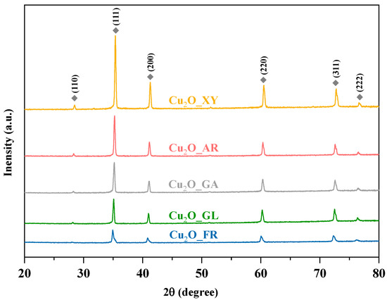 2.1. Investigation of Structural Properties of Cu2O Samples—Dependence on Reducing Agent