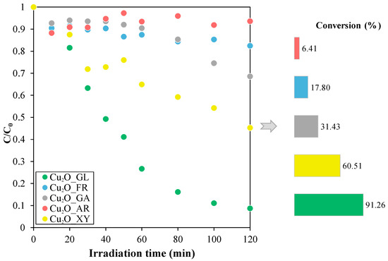 2.2. Investigation of the Effect of Reducing Sugars on the Photocatalytic Activity of Cu2O Samples