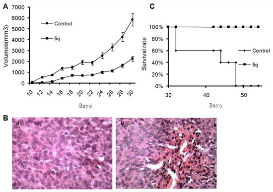 Effects of 5q on tumor-bearing mice. 5q was orally administered to Balb/c mice through gastric perfusion daily at a dosage of 75 mg/kg about 10 days after inoculation of cells. The volume of tumor was calculated by the following formula: volume (mm3) = long diameter (mm) × short diameter (mm)2 × 0.5236. (A) Oral treatment with 5q presents a decrease in tumor volume against untreated (p < 0.05). (B) H&E staining of tumor tissue sections of untreated group (a), 5q-treated group (b) (400×). (C) Oral treatment with 5q presents a survival advantage against untreated. Data are plotted as the percentage of survival animal.