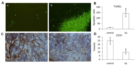 Observation of the pathology of the mice after 2 weeks treated with 5q or control was conducted. The apoptosis of cancer cells was measured by TUNEL assay. Compared to the scattered positive signals in the control group, clustered positive signals in the 5q-treated group strongly reflected the induction of apoptosis by the interference of 5q (Figure 2A,B). Inhibition of angiogenesis was also observed. The vessel density was measured with CD31 immunohistochemistry in the frozen sections. More than a 50% decrease in vessel density could be seen in the 5q-treated group compared to the control (Figure 2C,D).