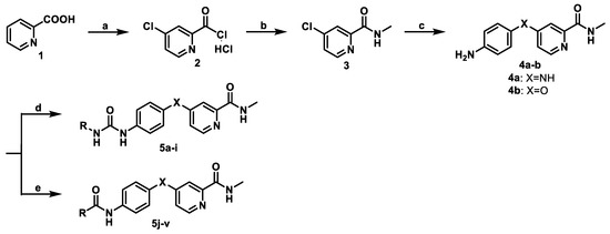The novel 4-(4-formamidophenylamino)-N-methylpicolinamide derivatives (5a–v) were prepared according to the general synthetic strategy illustrated in Scheme 1 [23,24]. One of the key intermediates, 4-(4-aminophenylamino)-N-methylpicolinamide 4a, was prepared as follows: commercially available 2-picolinic acid was reacted with thionyl chloride and subsequently treated with methylamine to give 3, which was heated with 4-amino-N-methylbenzamide at 160 °C with no solvent. The reaction mixture was dissolved in EtOH and concentrated HCl, then treated with 1% NaOH aqueous solution to yield 4a. The other key intermediate 4b was synthesized according to known methods [25,26,27]. With the key intermediates 4a and 4b in hand, derivatives 5a–i were prepared through condensation of 4a with aromatic isocyanates, which were easily gained via the treatment of substituted aniline or cyclohexylamine with triphosgene, in the presence of triethylamine. Using the same synthetic strategy, derivatives 5j–v were prepared through acylation of 4a or 4b with a series of substituted benzoyl chloride compounds. The structures of 5a–v were fully characterized by 1H-NMR, 13C-NMR, and ESI-MS analysis.
