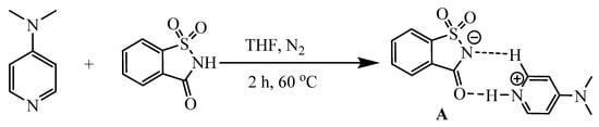 The preparation of DMAP·HSac (A) followed Lu’s literature procedure [28]. The reaction of DMAP with saccharin, as shown in Scheme 1, in tetrahydrofuran (THF) solvent at 60 °C, took place for 2 h in a nitrogen atmosphere to yield a white solid product of the adduct (A).