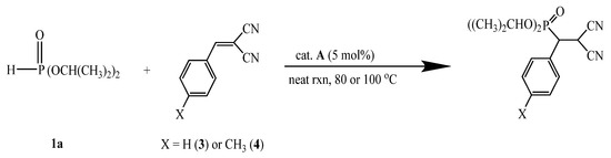 The catalyst A -catalyzed phospha-Michael addition reaction of diisopropyl phosphite (1a) with 2-(4-methylbenzylide)nemalononitrile (4) proceeded with a good yield at 80 °C in 2.5–3.5 h. However, the introduction of the electron donating group (X = CH3) into the benzene ring of compound 4 reduced the rate of the reaction, leading to increased reaction time (Table 3) compared to the unsubstituted one (3, X = H).