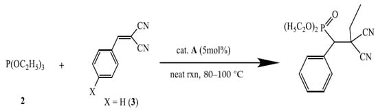 The reactants 2-benzylidenemalononitrile substrate (115 mg, 1 equivalent), phosphite reagent (2 equivalent) and the catalyst (A or B, (0.05 equivalent)) were added together, and the reaction was carried out without solvent for all the catalysts (see Scheme 2, Scheme 3, Scheme 6 and Scheme 7). Then, the reaction mixture was set to react at 80–100 °C for the given period of time before GC/MS analysis was performed to confirm the completion of the reaction.