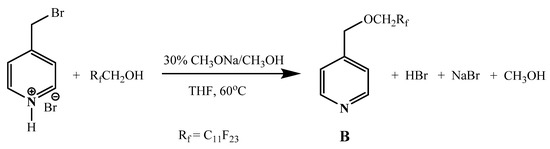 The synthesis of RfCH2OCH2-py (catalyst B) proceeds through two steps, as reported in the literature [41]. The initial step starts from the deprotonation of readily available fluorinated alcohols. Thus, Rf-CH2OH, where Rf = C11F23, was treated with 30% CH3ONa/CH3OH to give the corresponding alkoxides whose nucleophilic attack on 4-(BrCH2)-py·HBr gave rise to the synthesis of fluorous long-chained pyridine B, [4-(RfCH2OCH2)-py)] (see Scheme 5).