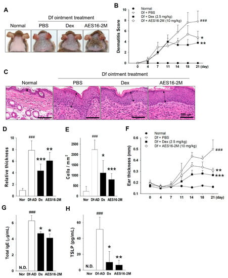AD was induced in mice as previously described [32]. Briefly, 4% of sodium dodecyl sulfate was applied to the shaved skin of six-week-old female Nc/Nga mice (Central Lab. Animal Inc., Seoul, Korea). Three hours post-SDS treatment, AD cream containing Dermatophagosides farinae (Df) body ointment (Biostir, Kobe, Japan) was applied topically on the shaved skin and ears (100 mg/mouse). The AD cream was administrated total 6 times in total over 3 weeks, and AES16-2M (10 mg/kg) or dexamethasone (2.5 mg/kg) was injected the day following AD cream treatment (S.C. injection, 6 times in total over for 3 weeks). Ten mice per group were used for the animal study. The mice were maintained in a specific pathogen-free facility and the experiments were performed according to the guidelines of the Korea University Institutional Animal Care and Use Committee (KUIACUC-2020-0022).