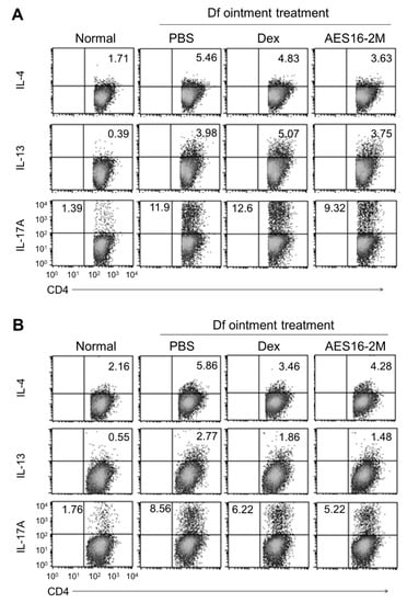 It is well known that Th2 cells, which secrete IL-4 and IL-13, and IL-17-producing Th17 cells, are involved in AD development [10,21]. For these reasons, the changes in the populations of Th2 and Th17 cells were examined in the spleens and draining lymph nodes of the AD mice. The flow cytometric results determined that either IL-4-, IL13-, or IL-17-producing CD4 T cells were increased by AD induction, and that these populations were smaller in the spleens and lymph nodes from AES16-2M treated mice (Figure 2). These results suggest that AES16-2M efficiently reduces the generation of Th2 and Th17 cells, and attenuates AD pathogenesis.