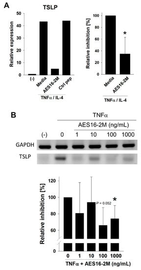 AES16-2M inhibits thymic stromal lymphopoietin (TSLP) expression in human keratinocytes in vitro. (A) Normal human epidermal keratinocytes (NHEKs) were activated with tumor necrosis factor-alpha (TNFα, 10 ng/mL) and interleukin-4 (IL-4, 50 ng/mL) in the presence or absence of AES16-2M (100 ng/mL). RNA was isolated and the TSLP expression levels were compared using quantitative PCR (left panel). The relative decrease assessed via three independent experiments is presented as a percentage of the TNFα/IL-4 control (right panel, n = 3). (B) TSLP expression was also confirmed using semi-quantitative PCR, and the visualized bands. The density of the band was evaluated using ImageJ, and relative decreases assessed via three independent experiments are presented as percentages vs. the TNFαcontrol (n = 3). For the relative decreases, the value from each set of the cytokine-treated control was presented as 100%, and the relative decreases were evaluated against the cytokine-treated controls. A non-paired and two-tailed Student’s t-test was performed to compare the experimental groups and control groups. * p < 0.05 (vs. not treated control).