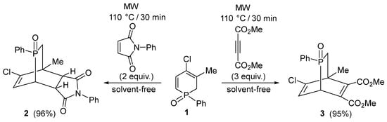 The Diels–Alder reaction of 1-phenyl-1,2-dihydrophosphinine oxide 1 with dienophiles, like N-phenylmaleimide and dimethyl acetylenedicarboxylate (DMAD), resulted in the formation of the respective phosphabicyclo[2.2.2]octene derivatives (2) and (3). The microwave (MW) technique was useful in shortening the reaction times and making the syntheses efficient. The MW-promoted reactions were 25 times faster than the thermal variations (Scheme 1) [].