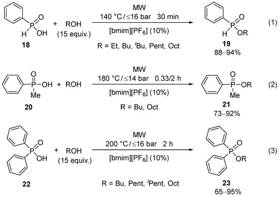 The esterification of the reactive phenyl-H-phosphinic acid (18) took place at a temperature of 160–190 °C to provide the phosphinates (19) in good (73–90%) yields []. The presence of [bmim][PF6] had a beneficial effect on the outcome (Scheme 5/(1)) []. Methyl-phenylphosphinic acid (20), and what is more, the sterically hindered diphenylphosphinic acid (22), could also be efficiently esterified in the presence of an IL (Scheme 5/(2) and (3)) [,].