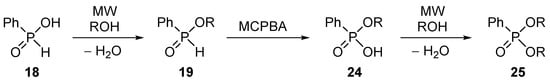 Our next targets were the phosphonic acids. In the first approach, the alkyl phenyl-H-phosphinates (19) were oxidized, then the ester-acid were esterified. However, we could not be satisfied with the efficiency (Scheme 6) [].