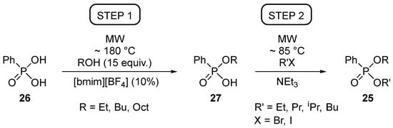 As an alternative possibility, phenylphosphonic acid (26) was also subjected to alkylating esterifications using BuBr. These reactions were complete and selective for the diesterification only when BuBr was used in a 5-fold quantity at 120 °C (Table 5) [].