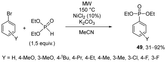 - Jablonkai, E.; Balázs, L.B.; Keglevich, G. A P-ligand-free nickel-catalyzed variation of the Hirao reaction under microwave conditions. Curr. Org. Chem. 2015, 19, 197–202. [Google Scholar] [CrossRef]