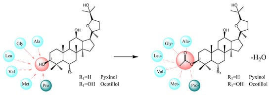 Amino acid imbalance is related to the liver diseases. For examples: the level of alanine (Ala) was found to be significantly reduced in cirrhotic rats, [58]; the levels of leucine (Leu) and valine (Val) were also clarified to decrease in patients with liver cirrhosis [50,59]; glycine (Gly) could alleviate liver injury in rats through its antioxidant properties [60]; methionine (Met) plays a key role in many cellular functions, deficiency of Met in rats could induce liver injury [60]; proline (Pro) could scavenge free radicals and reduce tissue damage in patients with liver cirrhosis [61]. What is more, the amino acids that make up natural proteins are all L-type, which is more prone to proteolysis. So, in the present study, the typical aliphatic amino acids (Ala, Leu, Val, Gly and Met) and heterocyclic amino acid (Pro) were chosen to modify pyxinol and ocotillol (Figure 1).