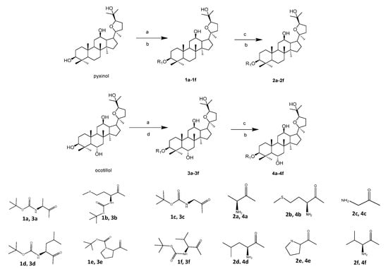 Synthesis of pyxinol and ocotillol derivatives 1a–1f, 2a–2f, 3a–3f, 4a–4f. Reagents and conditions: (a) DMAP, EDC, boc-amino acid, r.t. (b) dry CH2Cl2, r.t. (c) TFA, r.t. (d)THF, r.t.