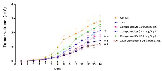 Tumors of the model group reached 10–18 mm in diameter on day 14. While CTX, compound 2e and compound 2e + CTX treatment resulted in delayed tumor growth compared with model group. It was showed that compound 2e groups (50, 100 mg/kg) could significantly reduce the tumor weight and volume compared to the model group (p < 0.05, p < 0.01). Treatment with compound 2e could decrease the tumor weight and increase the tumor inhibition rate (TIR) in a dose- dependent manner. Both CTX group and compound 2e + CTX group could significantly reduce tumor weights and volumes compared to the model group (p < 0.01). Compound 2e + CTX group displayed the highest TIR (55.30%).