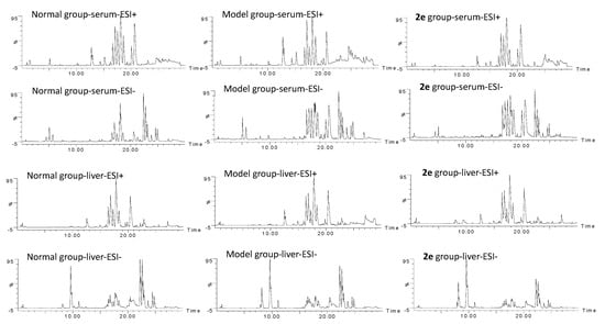 The serum and liver metabolic characteristics of normal group, model group and compound 2e (100 mg/kg) group in positive ESI (ESI+) and negative ESI (ESI–) modes were acquired. The representative BPI (base peak intensity) chromatograms are shown in Figure 5.