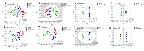 Principal component analysis (PCA) (A–D) and OPLS-DA (E–H) score plots of serum and liver metabolic profiling.