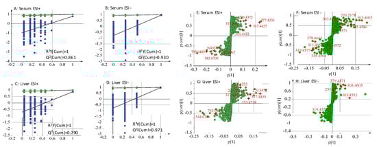 The permutation plots (A–D) and S-plots (E–H) of serum and the liver metabolic profiling.