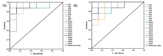 In addition, the predictive ROC curves, generated by using 21 candidate biomarkers, showed that the candidate biomarkers were potential diagnostic markers for liver tumor (Figure 8A) and were contributed to compound 2e treatment (Figure 8B). The area under curve (AUC) values and p-values of the biomarkers in ROC curves were listed in Table 8.