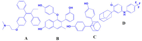 Structures of the oestrogen receptor (ER) modulators used as ER ligands: (A) tamoxifen; (B) 5-(4-hydroxyphenoxy)-6-(3-hydroxyphenyl)-7- methylnaphthalen-2-ol; (C) 4,4-(1,3-adamantanediyl) diphenol; (D) 3-(adamantan-1-yl)-4-methoxy-N-(4-(trifluoromethyl) phenyl) aniline.