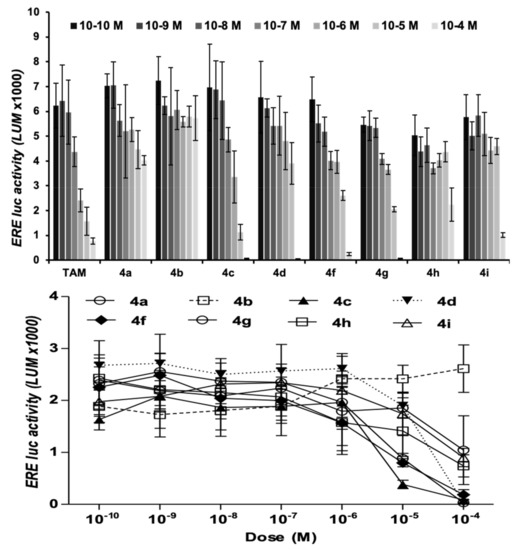 Next, to evaluate the activity of the synthesized compounds as agonists or antagonists to ERα, a reporter assay was performed with ERE-luc [22,27]. The results of ERE activity (inhibition (upper chart) and activation (lower chart)) in response to the compounds are summarized in Figure 3. Of the biphenyl derivatives tested, 4c, 4d, 4f, and 4g exhibited the most potent antagonist activity against ERα in a dosage-dependent manner, represented by the most significantly decreased luciferase activity. Tamoxifen was used as positive control. The IC50 value of 4c was 0.83 ± 0.06 µM compared to TAM 2.07 ± 0.09 µM, as measured using ERE reporter assay. None of the tested biphenyl derivatives demonstrated a significant agonistic effect.
