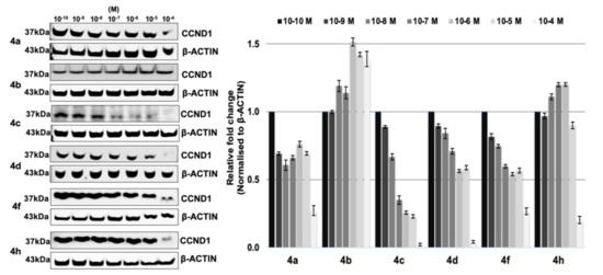 Increased expression of CCND1 is associated with approximately 50% of breast cancer cases and directly regulated by ER signalling [27,28]. To determine functional effects downstream of ERα, we examined the effect of ATBA compounds on hCCND1 protein expression in MC cells. Amongst the tested ATBA compounds, compound 4c most potently decreased the protein levels of CCND1 in MC cells in the nanomolar range when compared to other ATBA compounds (Figure 4).