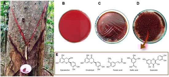 Virola oleifera in Espirito Santo, Brazil. The resin was collected from 0.5 cm-deep incisions in the tree trunk, as demonstrated in (A), and transferred into an amber glass vial (B). The fluid exudate was dried at 40 °C (C) and ground. Afterwards, the resin was sheltered from light at 4 °C until used as shown in (D). Previous chemical characterization by our research group revealed a high content of polyphenols, the main compounds demonstrated in (E) [16,33].
