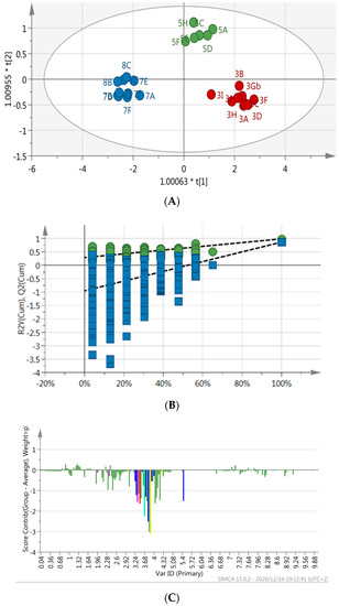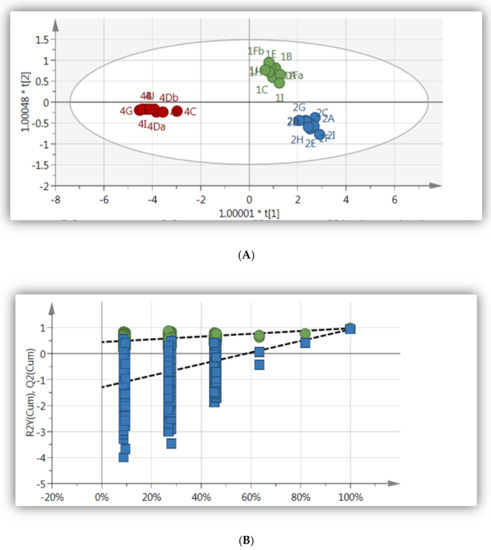 The supervised multivariate analysis model (OPLS-DA) showed a clear discrimination between the sample groups within the 95% confidence interval (Figure 4A). The computed model showed a good fit and predictability as presented by R2X = 0.93, R2Y = 0.88 and Q2 = 0.82 (Table 3, Figure 4A), respectively. Furthermore, the predictive capability of the computed OPLS-DA model was validated using the response permutation test (with n = 100). This statistical test compares the R2 and Q2 values of the true model the permutated model. Once again, it was observed that the true models have much higher R2 and Q2 (Figure 4B) values as compared with the permutated models.