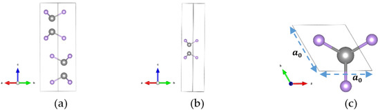 GaSe is a III-VI semiconductor which has many kinds of structures. In this study, we focus on the β-GaSe, which has a hexagonal structure and belongs to the P63/mmc group space [44]. For the bulk phase, the lattice constants of a unit cell are , and the corresponding angles are . The crystal structure of the bulk phase is shown in Figure 1a. The crystal structures of a monolayer GaSe unit cell, which contains two Ga atoms and two Se atoms, are shown in Figure 1b,c. In the following section, we focus on different sizes of monolayer GaSe.