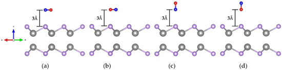 Firstly, we chose the Se atom on the top of the GaSe surface as the site where the CO molecule absorbed. To find the most favorable configuration, we investigated four different initial orientations of the CO gas molecule as adsorbed on the monolayer GaSe. The crystal structures, with the two in the horizontal direction and the two in vertical direction, are shown in Figure 3a–d, respectively. The initial vertical distance between the CO molecule and the top Se atom in the GaSe surface is .