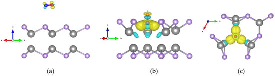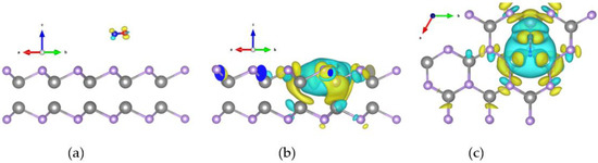 Differential charge density patterns of 3 × 3 monolayer GaSe adsorbed with a CO molecule, while considering a 3% tensile strain. The isosurface is . (a) Pristine structure; (b) side view of defective structure; (c) top view of defective structure.