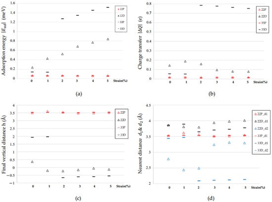 The calculation results of , , h, , and are shown in Figure 8a–d. The notations of 22 and 33 represent the 2 × 2 and 3 × 3 supercells, which are symbolized as triangles and bars, respectively. The notations P and D represent the pristine and defective structure shown in red and black, respectively.