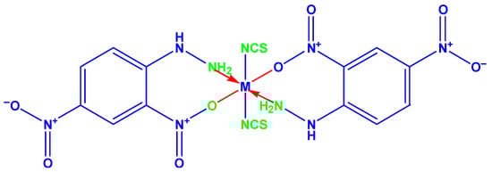 The FTIR spectrum of the ligands (DNPH) and their metal complexes were characterized at bands 3324, 1319 and 920 cm−1, assigned to ν(NH) amine and aromatic nitro ν(NO), in addition to ν(N–N) hydrazine, respectively, for DNPH [14]. In the IR spectrum, the complexes showed evidence of ligand bands through suitable shifts due to their complex formations [15]. The IR spectra of 2,4-dinitrophenyl hydrazine observed sharp peaks at 3324 cm−1 due to the ν(N-H) frequency, which was moved to a lower frequency at 3288–3278 cm−1 for the metal complexes, thus signifying that the amino nitrogen group is coordinated to a metal atom. Further supporting the observed ν(N-N) stretching frequency, it was shifted to a higher wave number in the metal complexes [16]. The ν(NO) symmetric stretching band was indicated at 1319 cm−1; furthermore, these band were shift higher at 53–38 cm−1, and there was a downward change of the ν(NO2) asym to 15–20 cm−1 in the spectra of the complexes. These findings indicate that the ligands were coordinated with metal ions through the one oxygen of the nitro group [17]. The new bands in the complexes were about 2072–2095 cm−1 due to the ν(SCN). These results showed that thiocyanate coordinated with the metal ions through the nitrogen atom bonded to NCS in iso-thiocyanate mode [18,19,20]. The lower frequency bands appeared in two synthesized complexes at 539–551 cm−1, in addition to 412–496 cm−1, which was attributed to the ν(M-O), as well as ν(M-N) bands, correspondingly [21]. The FTIR spectra results showed that the ligands were coordinated with metal ion via amino N, nitro O and SCN nitrogen atoms engaging coordination sides in the complexes.